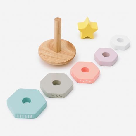 ツリーをイメージしたスタッキングリング。てっぺんのお星さまとゆらゆらゆれる動きが夢見心地な気持ちにさせてくれます。六角形のリングを積んだり、外したりするほか、大きさくらべやリングの穴をのぞいてみたりなど、シンプルながら遊びの要素が多く、お部屋に飾っても可愛らしいデザインです。